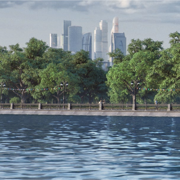 На заднем плане заметны очертания Москвы-Сити — делового «сердца» мегаполиса. Они напоминают о близости ко всем преимуществам и инфраструктуре большого города.