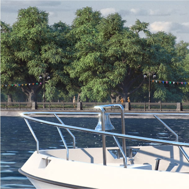 Мы отразили позиционирование объекта в слогане «Тихий курорт в большом городе», и на его основе подготовили креативную концепцию KV. Комплекс показан в окружении природы на берегу реки. На первый план мы добавили белоснежную яхту, чтобы у зрителя не возникало сомнений относительно категории рекламируемого жилья.