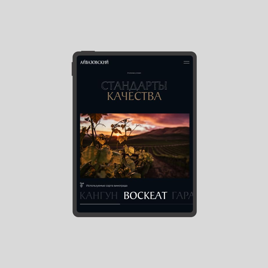 Вдохновившись идеей о том, что каждый элемент коллекции коньяков — это неповторимый шедевр, мы представили бутылку как главный экспонат, который можно рассмотреть со всех сторон. Эта концепция стала основой главной страницы.