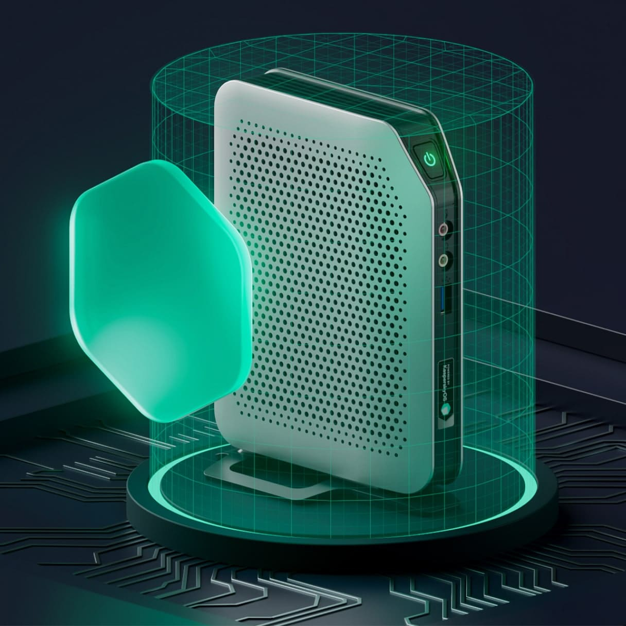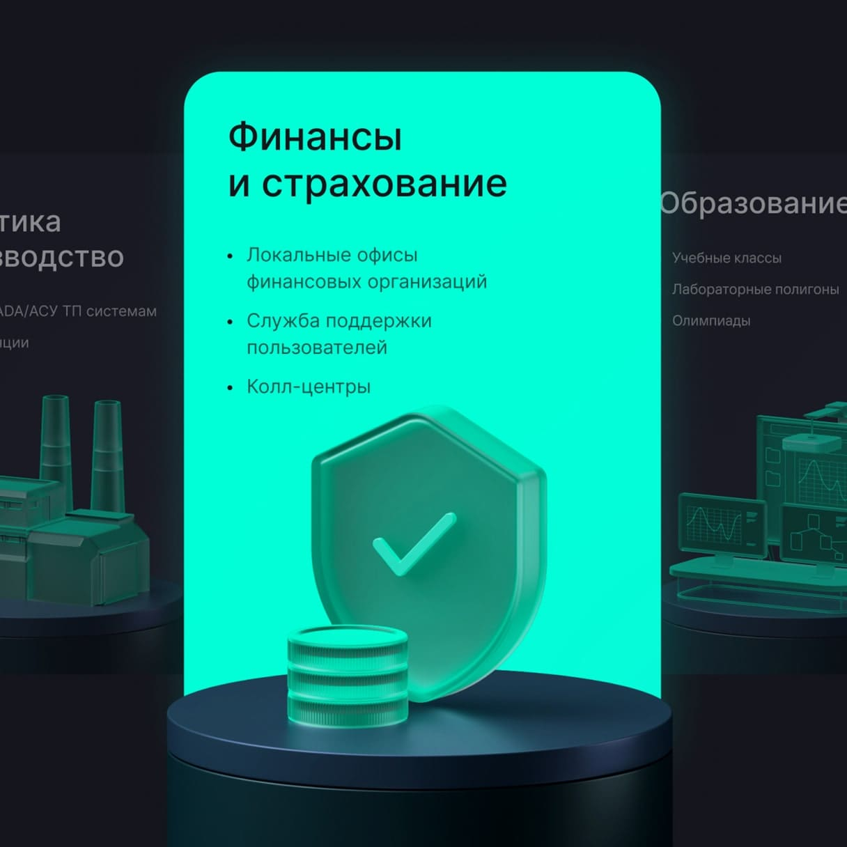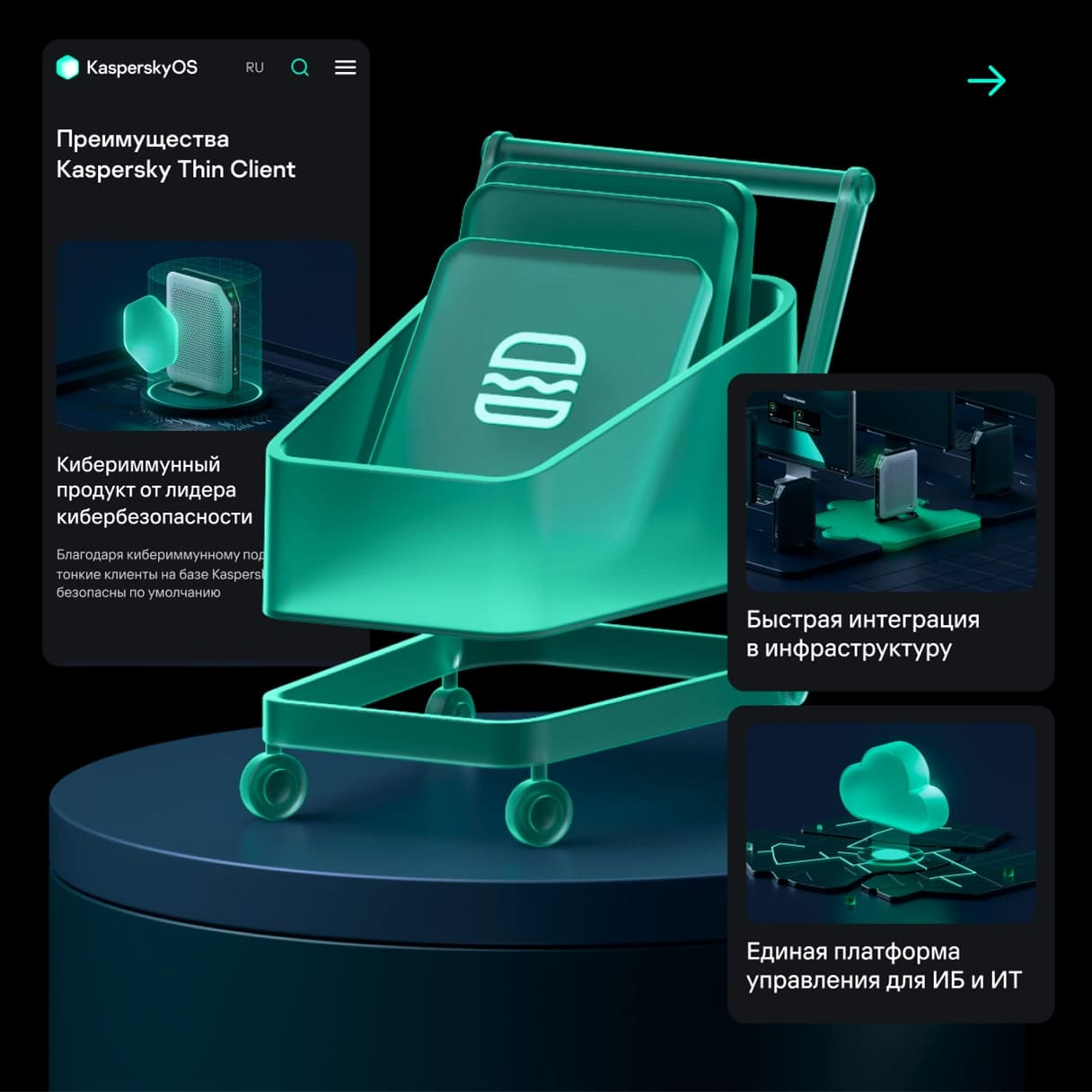 Мы создали анимацию для лендинга, показывающую интеграцию тонкого клиента в рабочую инфраструктуру. Также разработали 3D-иконки в стиле глассморфизм и модели, иллюстрирующие рабочие места, сейф-куб и щит для блока преимуществ. Для мобильной версии мы адаптировали анимацию: на смартфонах сначала показывается тонкий клиент, затем его интеграция в рабочее пространство, и только потом текст, чтобы не перегружать внимание пользователя.