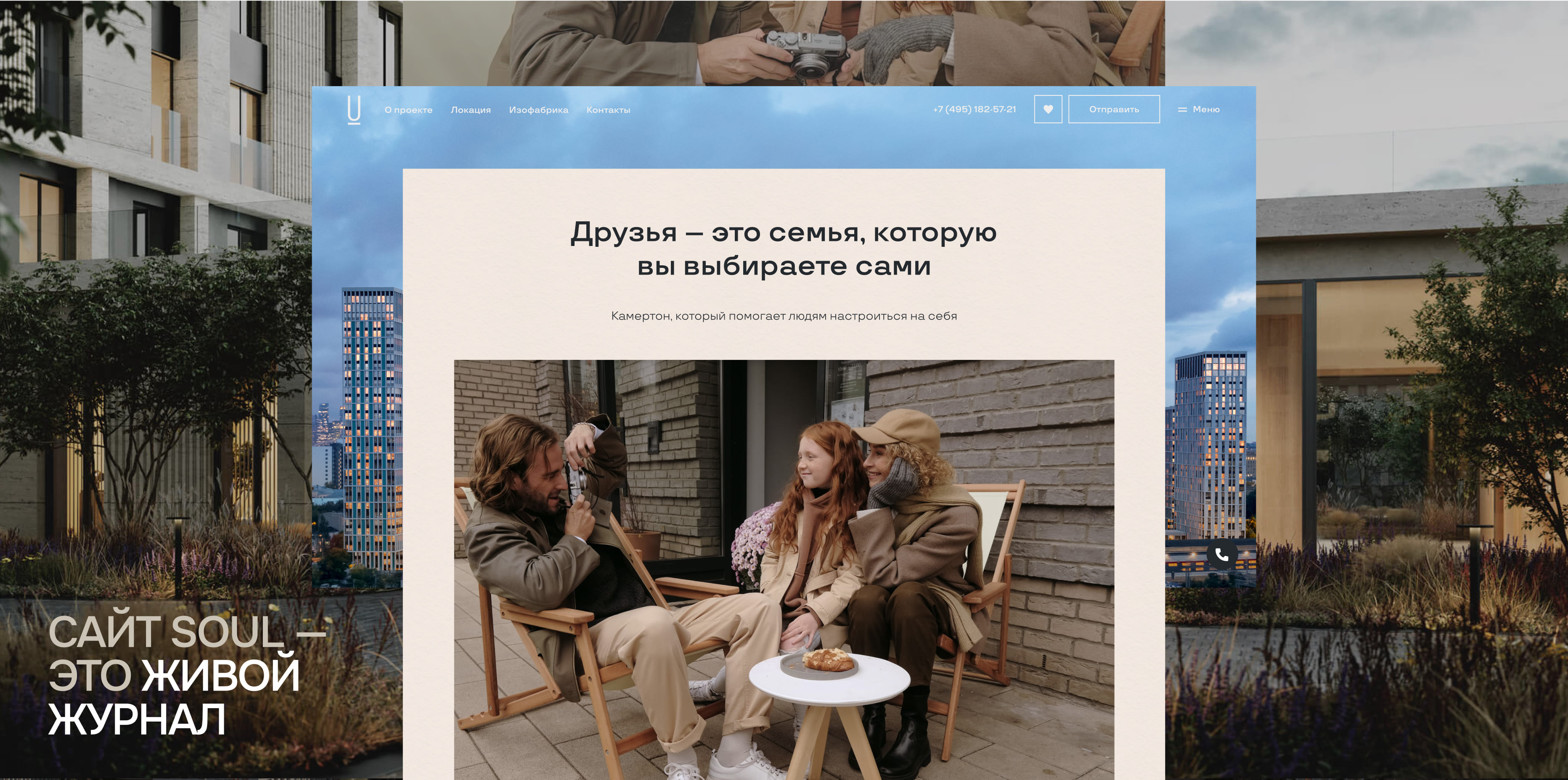 Сайт SOUL был задуман как «живой журнал», который отражает концепцию комплекса — возвращение к настоящему, эмоциональному взаимодействию с окружающей средой. Мы создали сайт, который листается как альбом воспоминаний, с теплыми, ламповыми фотографиями. Главное здесь — текстуры, фактуры, люди и неподдельные эмоции. Каждый раздел раскрывает комплекс с новой стороны, но все они объединены общей тёплой атмосферой жизни.