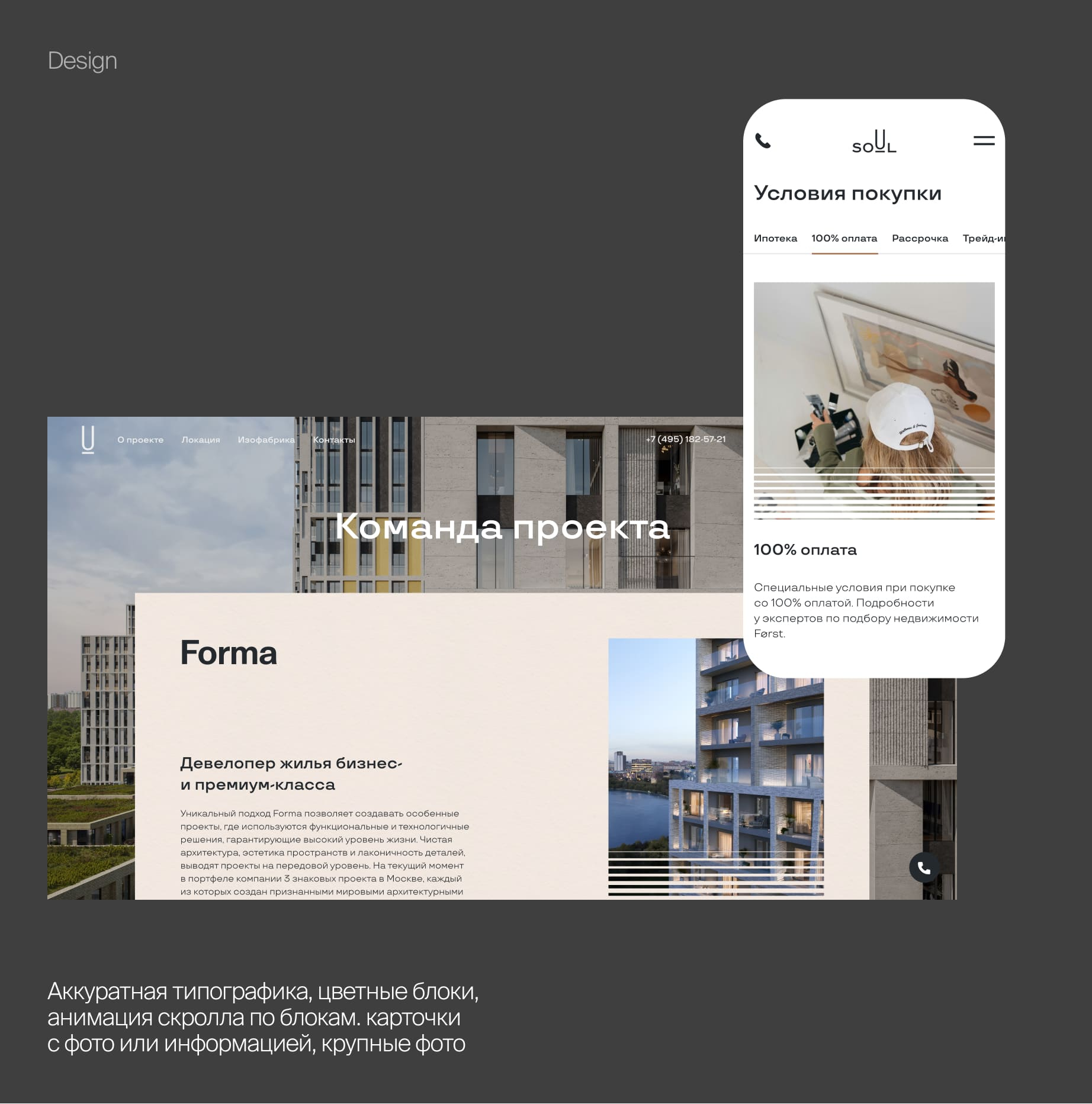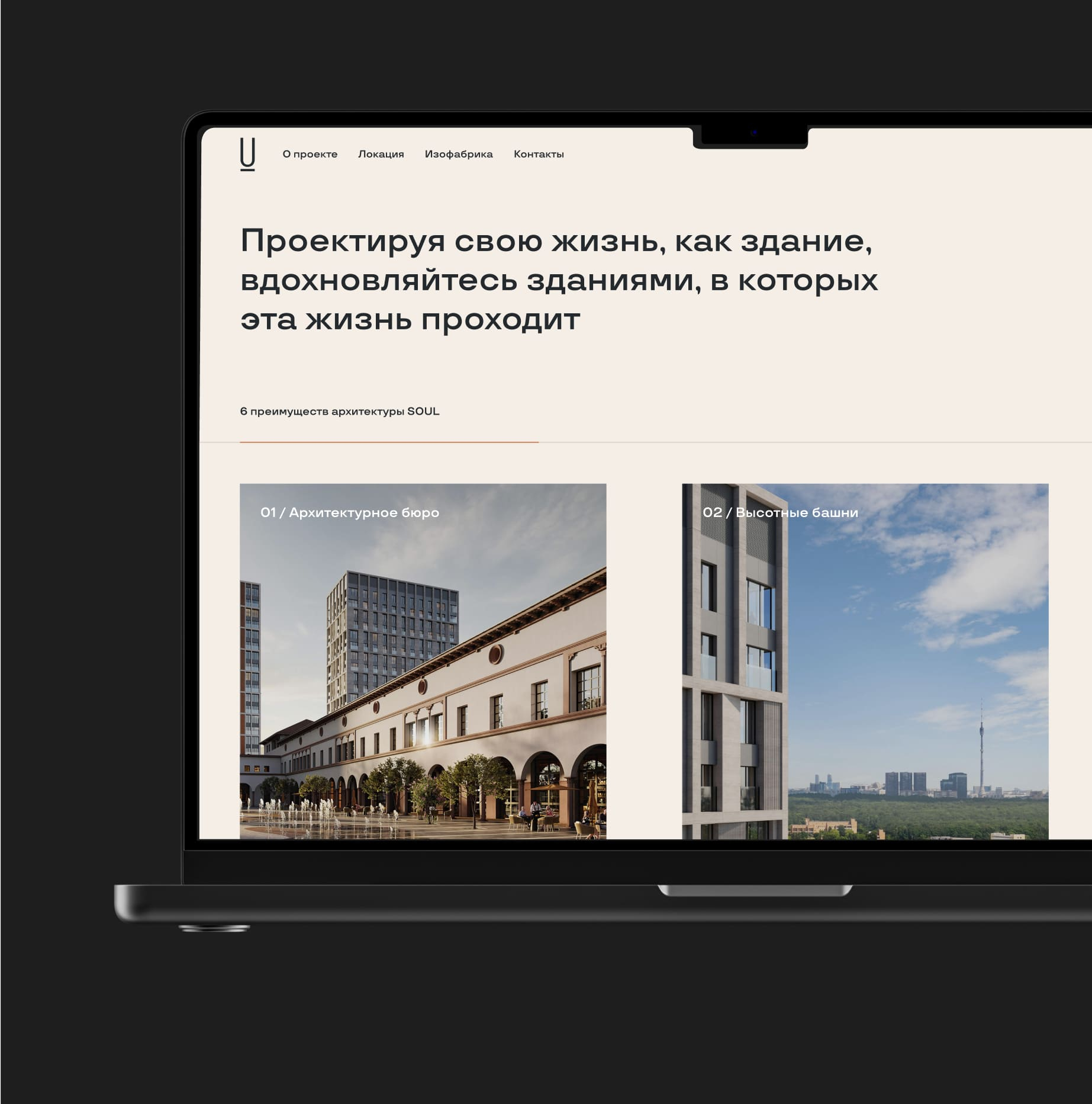 Наша задача заключалась в создании дизайна сайта, который вдохновит будущих жителей выбрать SOUL. Девелопер сделал акцент на образовательной и творческой инфраструктуре, а мы постарались передать атмосферу комплекса, подчеркнув историческую значимость, архитектуру и инфраструктуру для жителей.