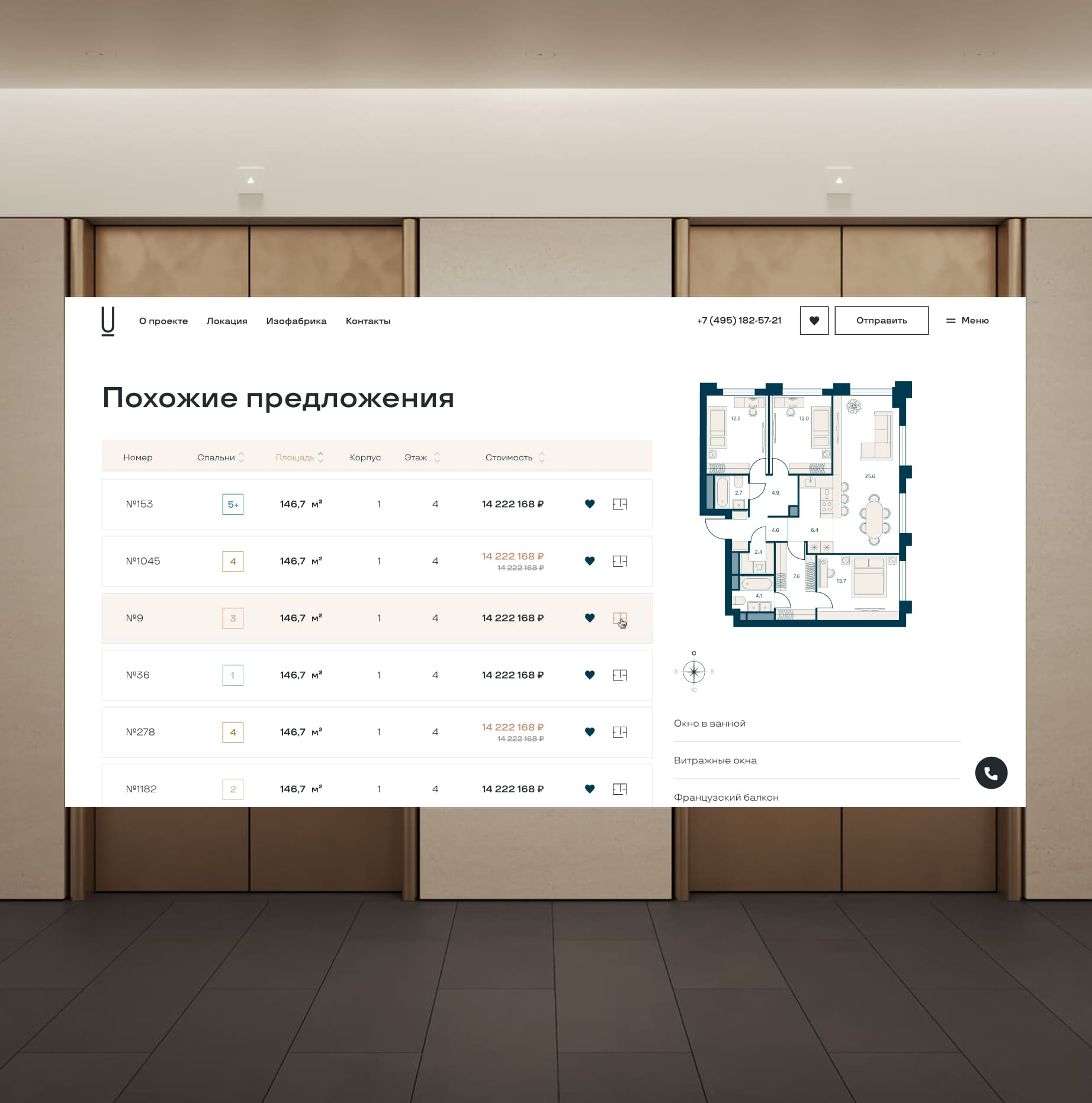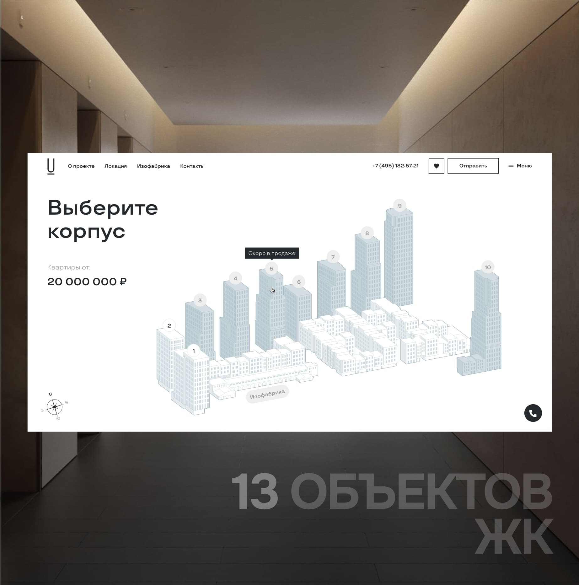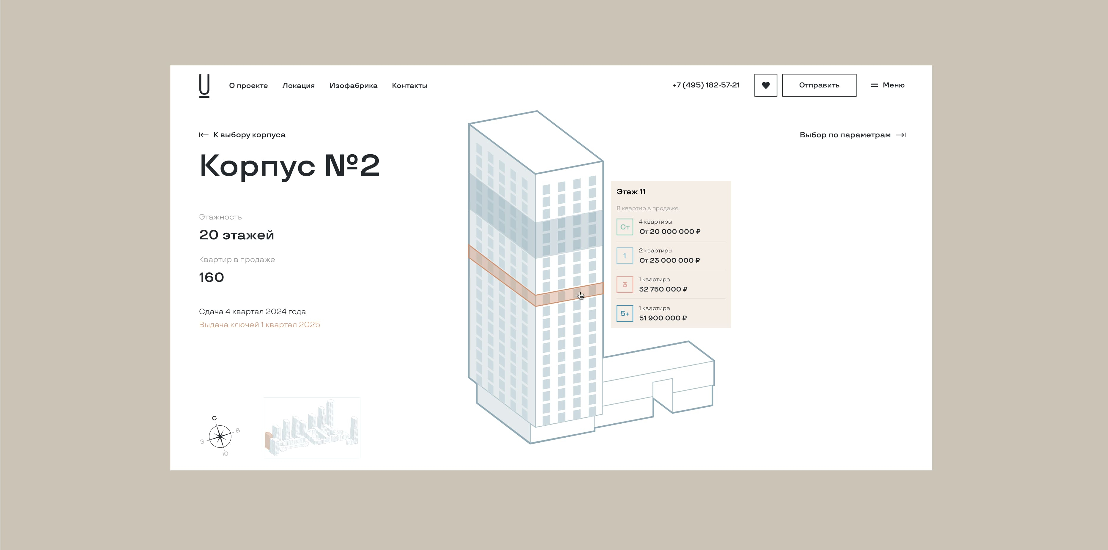 Одним из ключевых элементов сайта стал интерактивный подборщик квартир. Пользователи могут выбирать квартиры прямо на 3D-модели корпусов, просматривая доступные этажи и планировки, или воспользоваться фильтрами на странице со списком доступных вариантов. Мы сделали интерфейс простым и интуитивным, чтобы каждый мог легко найти жилье, соответствующее его предпочтениям. Визуальные элементы и плавная навигация помогают пользователям погрузиться в атмосферу комплекса, создавая ощущение настоящего присутствия.